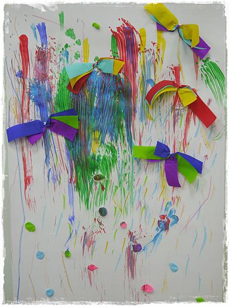 請媽咪幫忙用三張皺紋紙疊一起在中間轉三圈作成漂亮的蝴蝶結,