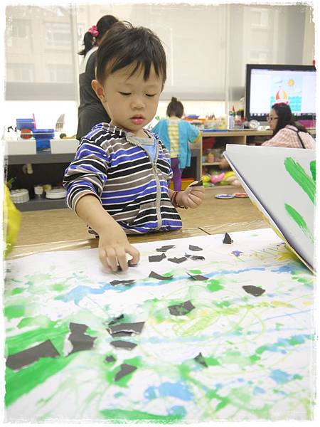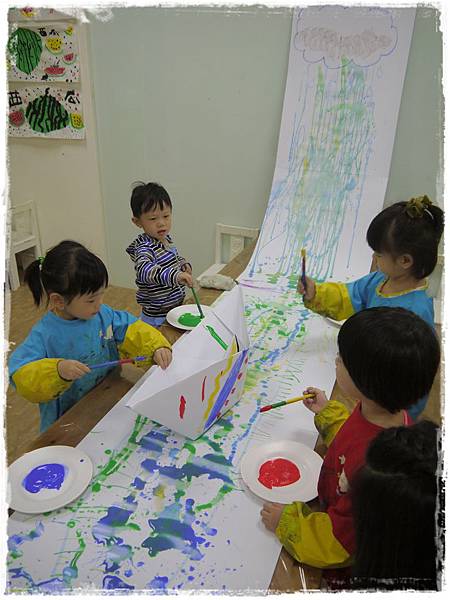 今天做的是集體創作,從牆上到桌上,老師先垂掛一張白紙,
