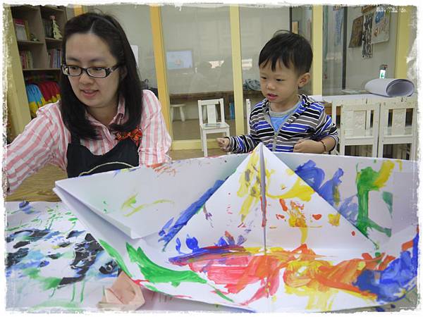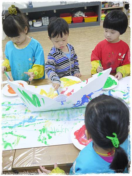 老師將事先折好的大船放置於水上悠游,孩子們用水彩自由彩繪大船後,