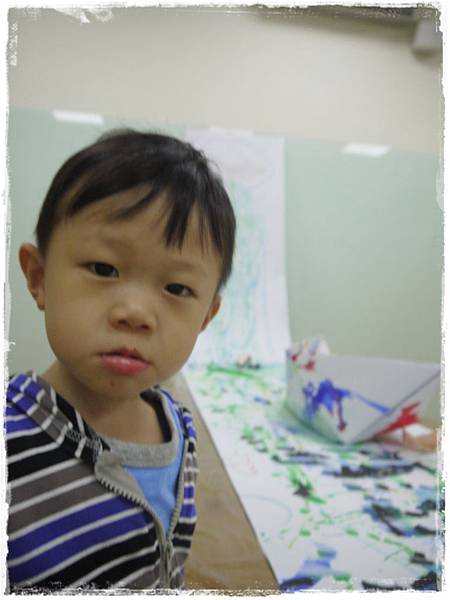 再教導大家折小船,換用蠟筆彩繪小船。最後讓孩子撕片片黑紙當石頭,就完成囉!!