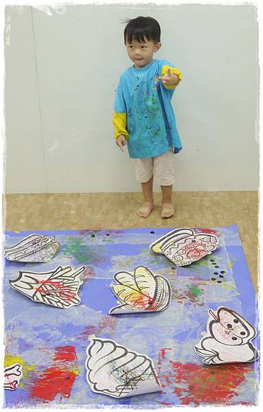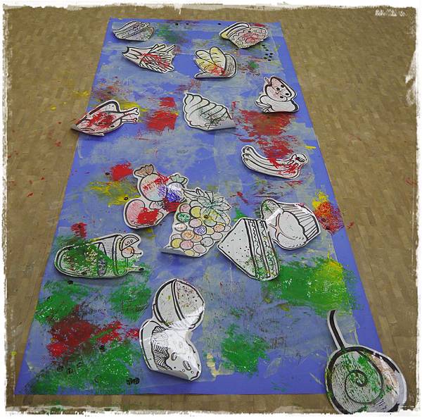 這禮拜依舊是集體創作,老師準備了一張水藍色的紙鋪在地面上,