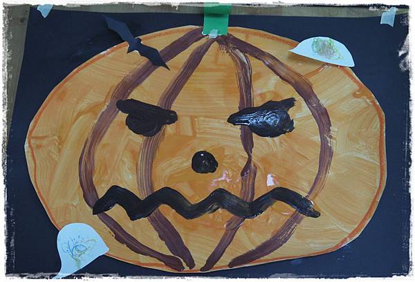 老師也會各發兩張小精靈圖卡讓孩子用蠟筆畫上五官,裝飾南瓜後,就完成囉