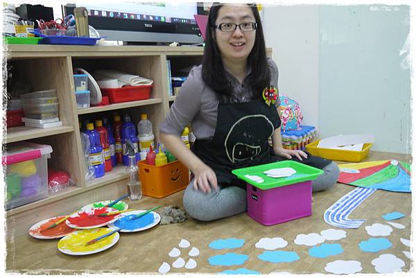 最後用蠟筆在事先剪好的雲朵、水滴紙片上著繪,將其黏在傘片上裝飾就完成囉