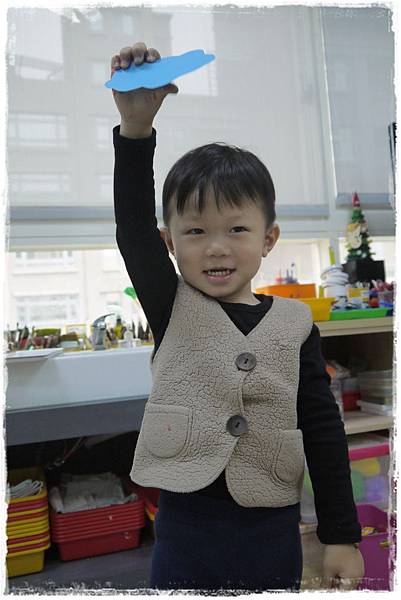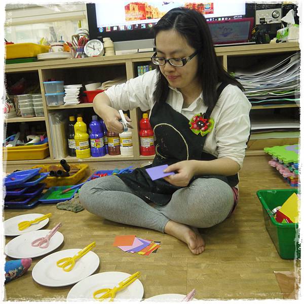 最後老師發四張色紙,讓孩子用剪刀剪紙(大約紙的2/3長)、
