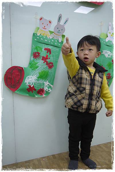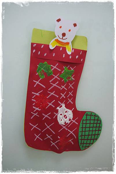 再用白膠拍拍他們的肚子,黏貼在襪子上面,可愛的聖誕襪就完成囉~~