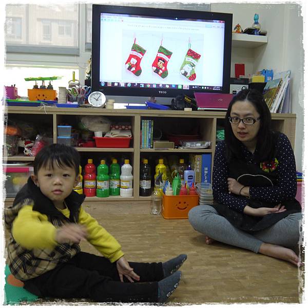 老師讓孩子們自由選擇事先剪好的紅、綠兩色的襪子造型紙來當主體,