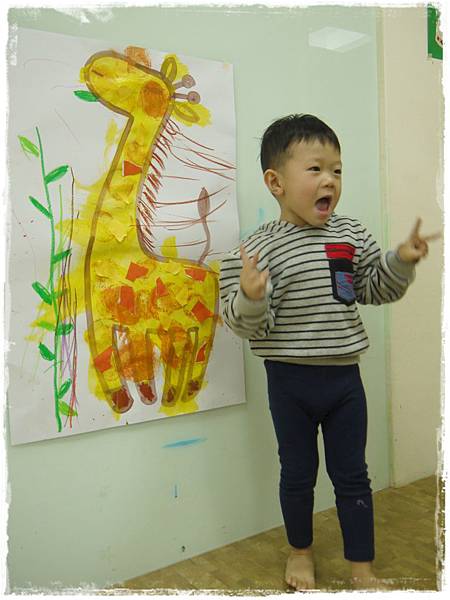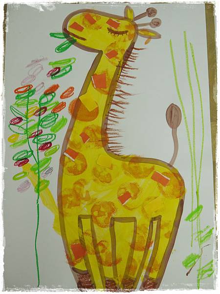 最後再用彩色蠟筆畫出長頸鹿的食物-樹葉,就完成囉!!