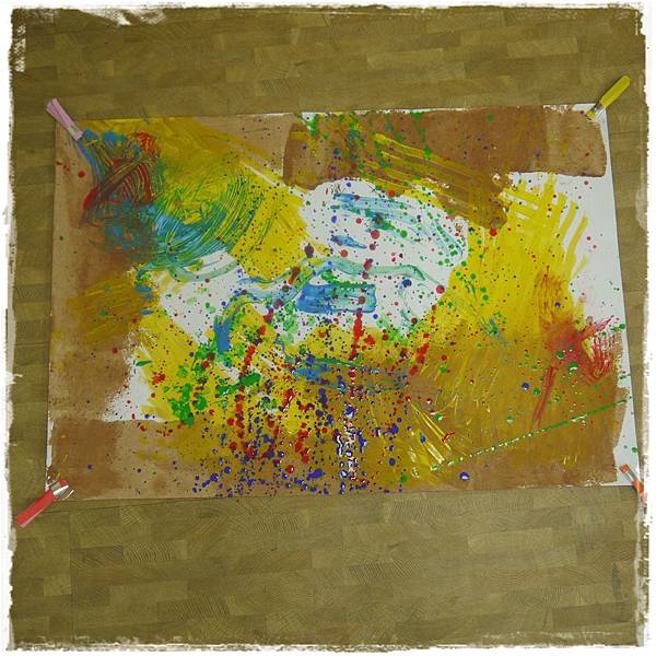 用各式刷子在毯子上刷出不同的彩色圖案、用水彩筆沾彩色顏料甩出水珠在上面!!!