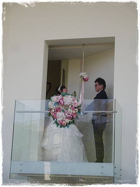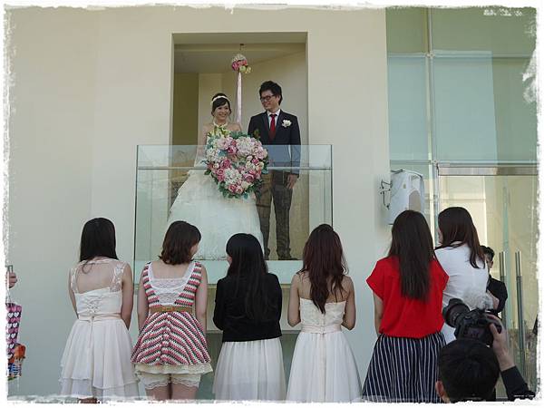 儀式完畢後,新人們上了禮堂外的小閣樓,拋下下一個幸福捧花,