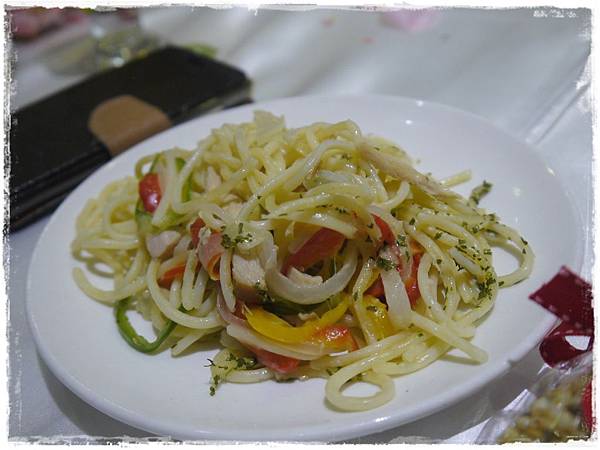 自助區餐點有四五道~包括新鮮蔬菜沙拉杯、湯品、義大利麵和酒,飲料則是柳橙汁