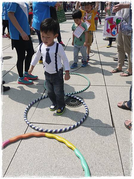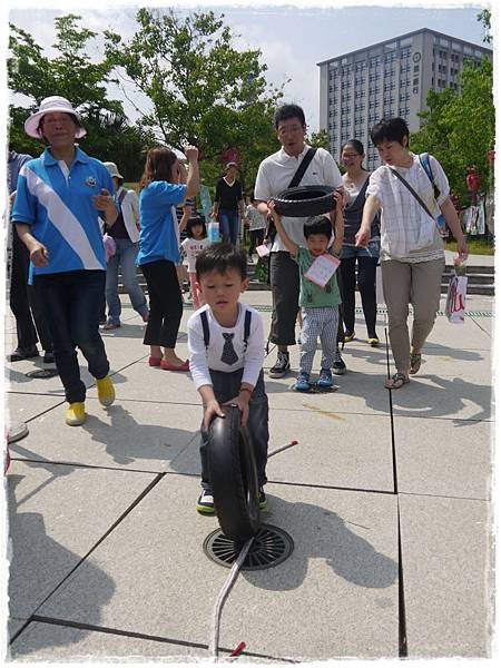 遊戲規則: 扶著輪胎沿著線走,單腳跳呼拉圈,過關囉