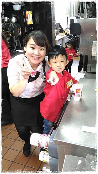 最能代表麥當勞的紅色制服,嘟寶穿上後依舊帥氣…