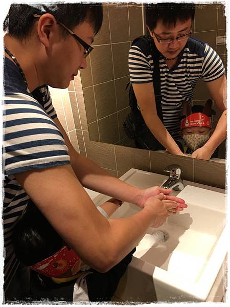 活動開始,家長要先幫孩子換穿上可愛的圍裙,再一起去洗手…