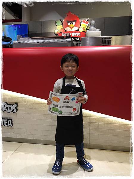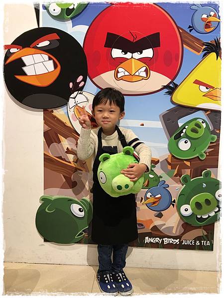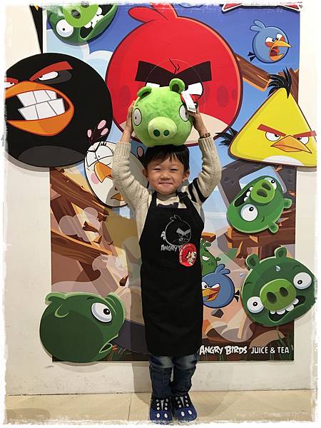 穿上可愛的憤怒鳥圍裙與貼上識別貼紙名牌