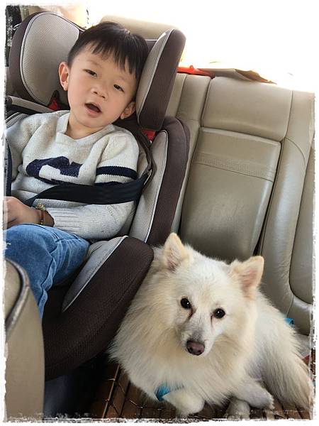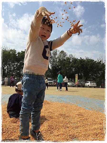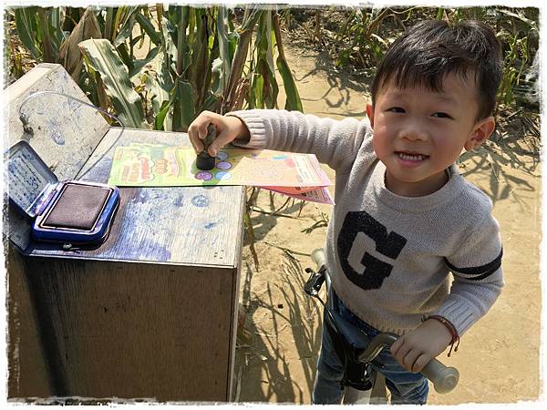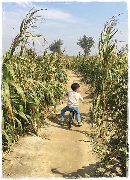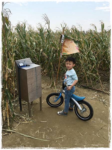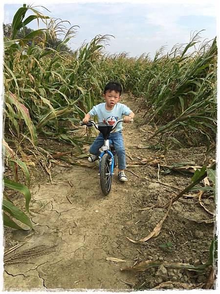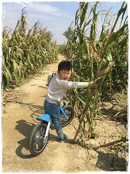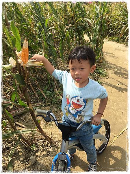 嘟寶邊滑著車,邊cue媽咪幫他跟玉米拍照呢~