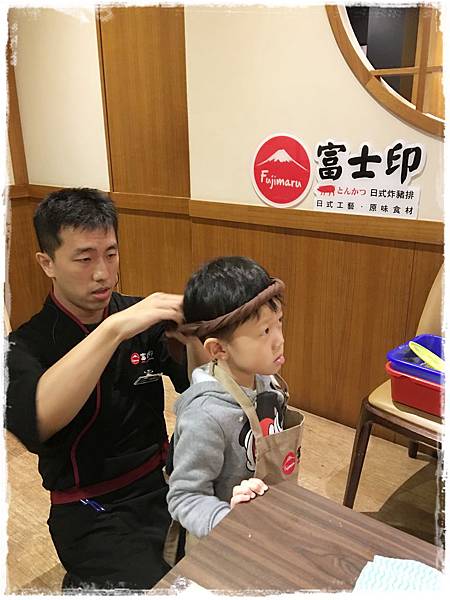 大哥哥幫嘟寶穿上圍裙與頭帶,