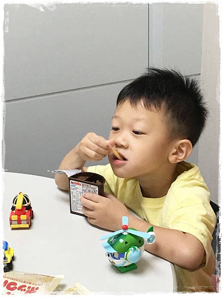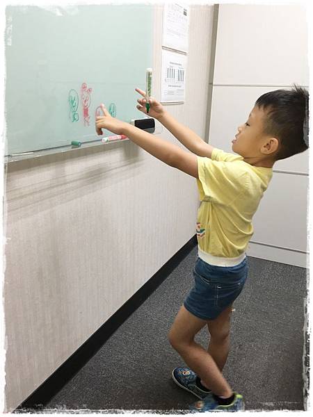 嘟寶看到白板樂的開始大塗鴉...阿伯也送了薯條三兄弟和巧克力棒給嘟寶吃