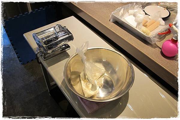 鋪上軟地墊,將拉麵麵糰放進塑膠袋裡,準備來踩踩踩囉!!