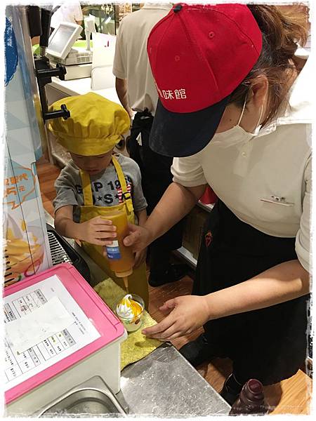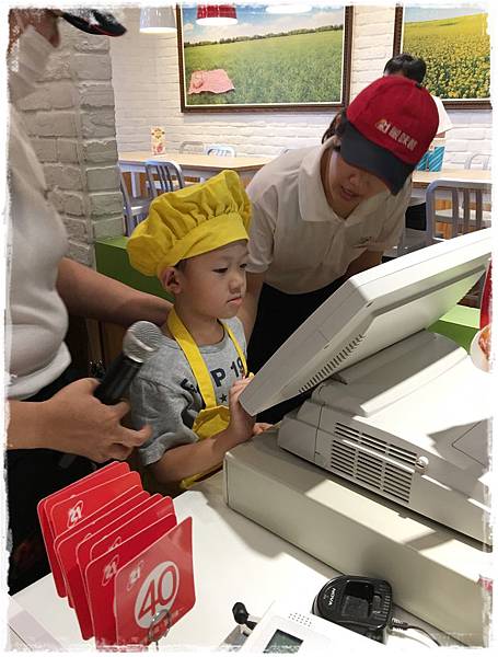 由店員姐姐協助嘟寶幫客人(馬麻)點餐