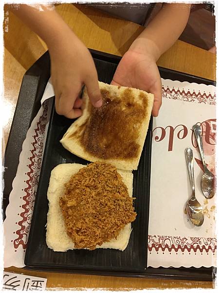 將吐司分別抹上醬料,夾上店家炸好的腰內肉