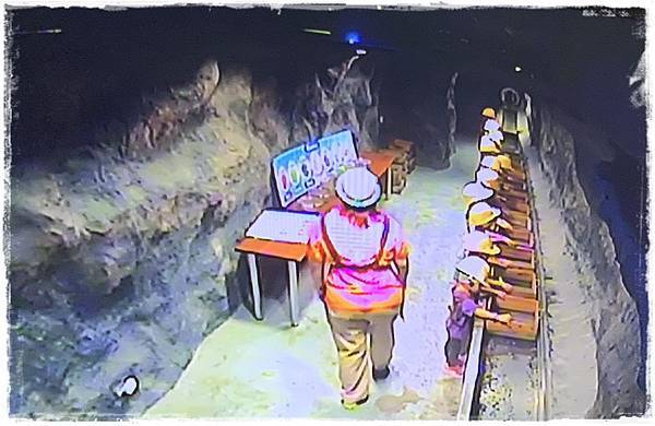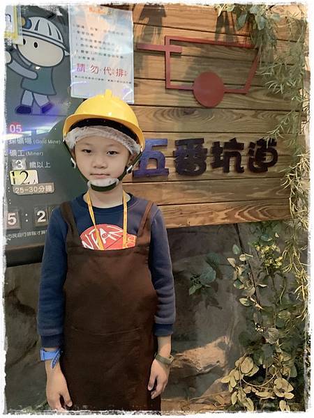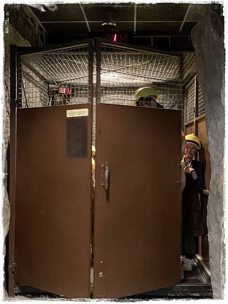 戴上安全帽,換上礦工裝,假裝坐電梯深入地底進行礦坑作業