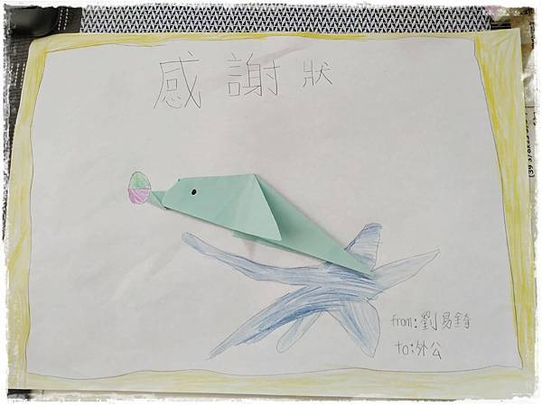 嘟寶主動的做了感謝狀送給外公,還揪外公一直自拍祖孫照